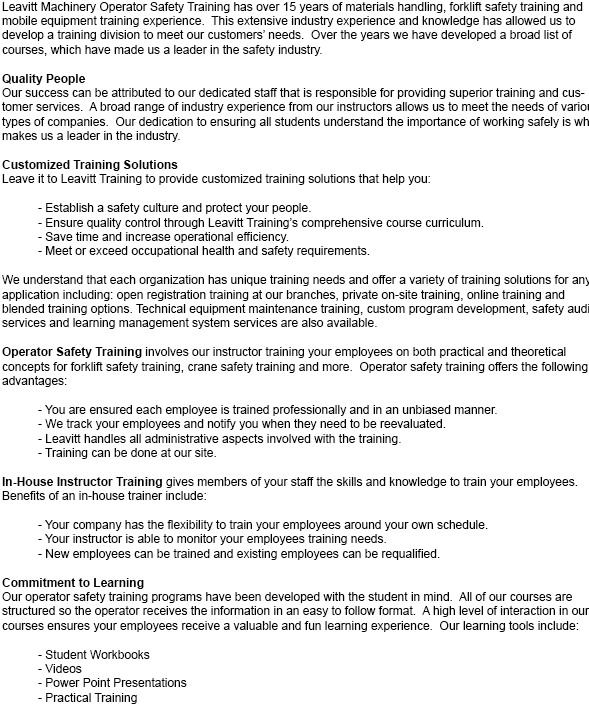 We provide numerous options to help teach your staff. Whether you are looking for somebody to come instruct at your place of work or would prefer to train at our facility, we can accomodate all your needs. Each course can be tailored to your equipment and workplace.